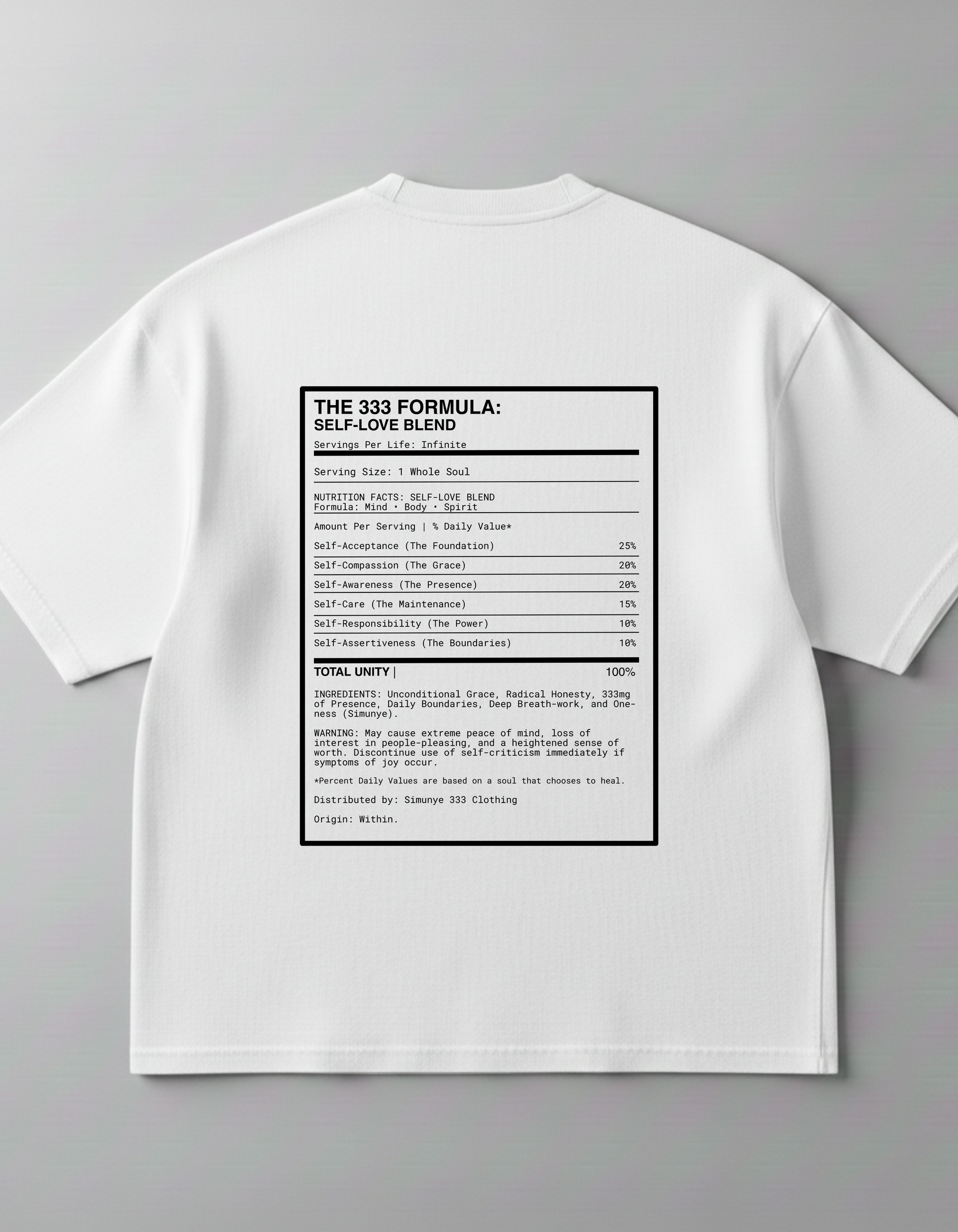 Back: A bold "Nutrition Facts" label that breaks down the ingredients of your highest self, including 25% Self-Acceptance, 20% Self-Compassion, and 100% Total Unity.